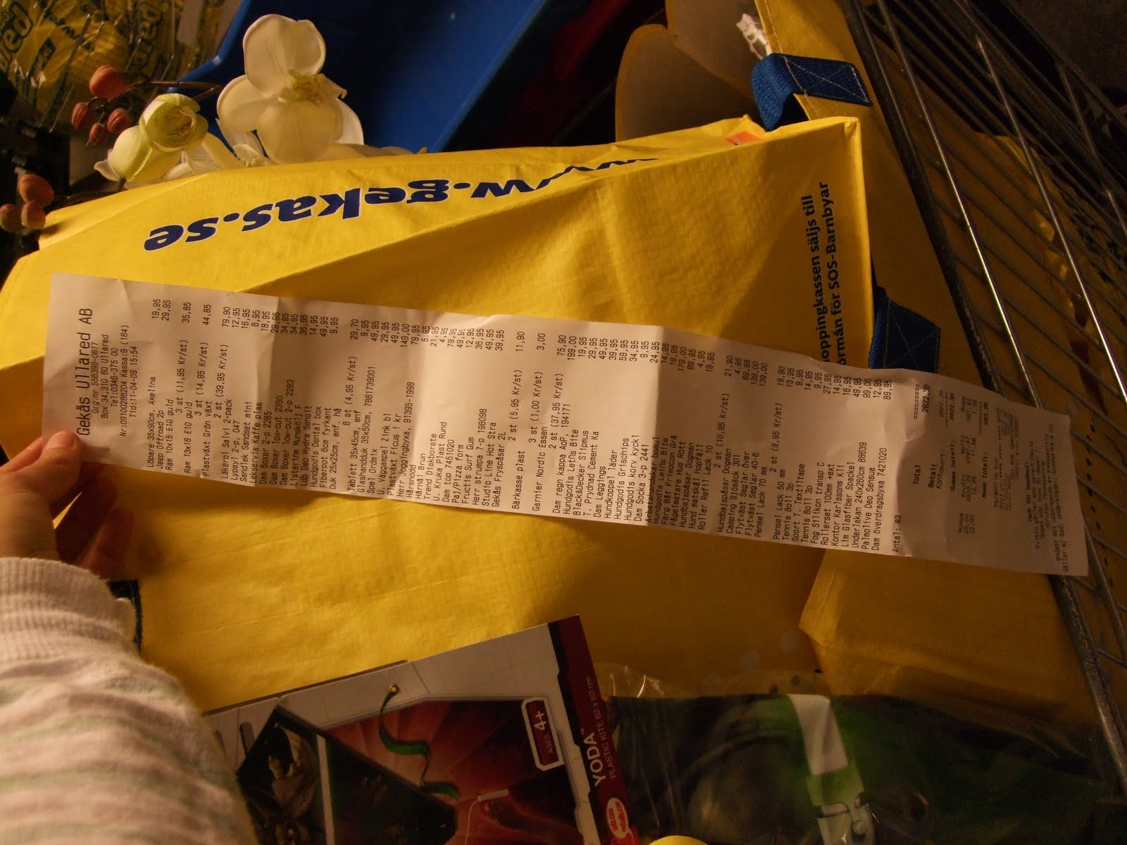 Kvitteringen ble ganske så lang. Jeg jeg vil påstå at det meste som står der er fornuftige ting. Det meste ville jeg ha kjøpt uansett, med unntak av en blomstrete regnjakke og en keramikk-kanin.